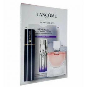 НАЙТИ ВЫГОДНЕЕ - Lancome La Vie Est Belle женский Mini Set: парфюмерная вода 4 мл + Тройная сыворотка для лица и шеи Rénergie 3 мл + Hypnose Тушь для ресниц 2 мл