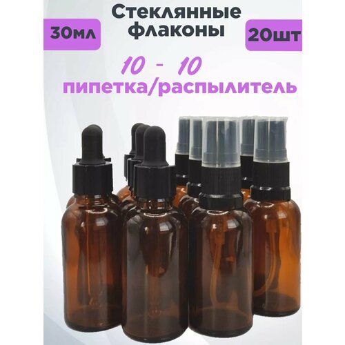 Набор 20 флакона 10 распылитель 10 пипетка. Стеклянный флакон с распылителем объемом 30 мл. из полупрозрачного темного стекла. Распылитель спрей создает большое облако из мелких капель, что позволяет как наносить средство на поверхность ровным слоем, так и использовать флакон в качестве аэрозоля и атомайзера. Косметический стеклянный флакон с пипеткой объемом 30 мл. из полупрозрачного темного стекла. Это один из самых популярных объемов для косметических флаконов. Бутылочка идеально подойдет для хранения масел, сывороток и других жидких косметических и фармацевтических средств. Удобная стеклянная пипетка с резиновой грушей помогает аккуратно дозировать использование жидкости, а темный цвет стекла обеспечивает защиту от света. Вы можете выбрать комплект от 1 до 20 штук. Упаковка в картон и пупырчатую пленку обеспечат сохранность при доставке как для самих флаконов, так и для стеклянной пипетки. Бутылочка имеет стандартную горловину 18/410 и может быть использована с другими крышками. Вместе с пустым флаконом вы получите наклейку белого цвета и сможете подписать, какое средство вы храните в каждой бутылочке