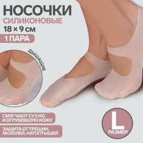 Погрузитесь в мир заботы о своих ногах с инновационными силиконовыми носочками для педикюра носочки насыщают кожу питательными веществами, делая её мягкой и гладкой. Удобство использования: просто наденьте носочки и расслабьтесь, пока они работают на вашу красоту. Перфорация: обеспечивает циркуляцию воздуха, предотвращая избыточное потоотделение и дискомфорт. Компактная упаковка: удобно хранить и брать с собой в поездки, чтобы всегда быть готовыми к уходу за ногами. Идеально для домашнего использования: создайте атмосферу спа прямо у себя дома и побалуйте себя уходом за ногами. Выбор силиконовых носочков для педикюра — это шаг к здоровым и ухоженным ногам. Позвольте себе насладиться моментами заботы о себе и ощутите разницу Носочки силиконовые помогают ухаживать за кожей стоп и пяток. Они усиливают действие кремов и масок, не создают затруднений при ходьбе. При регулярном использовании ножки день за днём будут становиться более гладкими и мягкими. ОсобенностиЗащищают от появления трещин. Смягчают сухую и огрубевшую кожу. Защищают от подошвенного фасциита, метатарзалгии и мозолей. Выводят излишнюю влагу через специальные отверстия, благодаря чему нога дышит. Снижают трение между пальцами ног. Одеваются на босую ногу или на носочки. Носочки комфортно фиксируются на ноге. Как использоватьПодержите ноги в горячей воде в течение 30 минут. Нанесите увлажняющий крем. Наденьте силиконовые носочки.