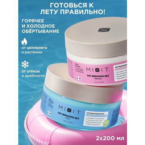 Миксит Подарочный набор для ухода за кожей тела, ускорения похудения, избавления от целлюлита и растяжек FAT BREAKING SET. В антицеллюлитный бьюти бокс входит охлаждающее крио обертывание с текстурой геля Cryo и разогревающее термо обертывание с текстурой крема Thermo. Каждое средство в банке 200 мл. Холодное обертывание с мятой и ментолом борется против целлюлита и отеков, способствует повышению упругости кожи и коррекции фигуры. Также мятное средство направлено на осветление пигментных пятен и подтяжку проблемных зон рук и ног, груди, живота и ягодиц. Горячее термообертывание с перцем и маслом ши направлено на отбеливание тона кожи, уменьшение отечности и активное жиросжигание. Благодаря согревающему эффекту в сочетании с ручным массажем средство оказывает лимфодренажное действие. Комплекс с натуральным составом.