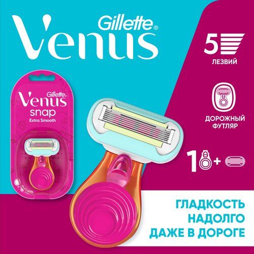 Компактная женская бритва Venus Snap для мгновенной гладкости. Venus Snap- малышка с 5 лезвиями, которую удобно взять с собой и в отпуск, и в тренажерный зал. Преимущества: - Удобно взять с собой: мини-ручка и дорожный футляр легко помещаются даже в небольшую сумку; - Увлажняющая полоска с маслом авокадо: помогает защитить кожу от раздражения и порезов; - Бритва с 5 лезвиями обеспечивает невероятную гладкость на длительный срок; - Каждое из пяти лезвий мягко вытягивает волосок, срезая его ближе к корню; - Лезвия с алмазоподобным покрытием и увлажняющей полоской обеспечивают мягкое и плавное скольжение бритвы, легко срезая волоски; - Удобный чехол входит в комплект. Любая сменная кассета Venus подходит к любой бритвенной ручке Venus (кроме Simply Venus и Venus для зоны бикини). Страна производитель- Мексика. Срок годности: 60 месяцев.