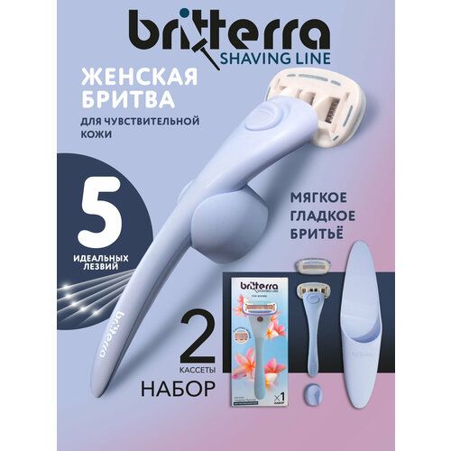 НАЙТИ ВЫГОДНЕЕ - Бритва женская 5 лезвий BRITTERRA FOR WOMEN BLUE, Набор: станок для бритья, 2 сменные кассеты, держатель настенный, чехол для хранения