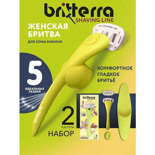 НАЙТИ ВЫГОДНЕЕ - Бритва женская 5 лезвий BRITTERRA FOR WOMEN YELLOW, Набор: станок для бритья, 2 сменные кассеты, держатель настенный, чехол для хранения