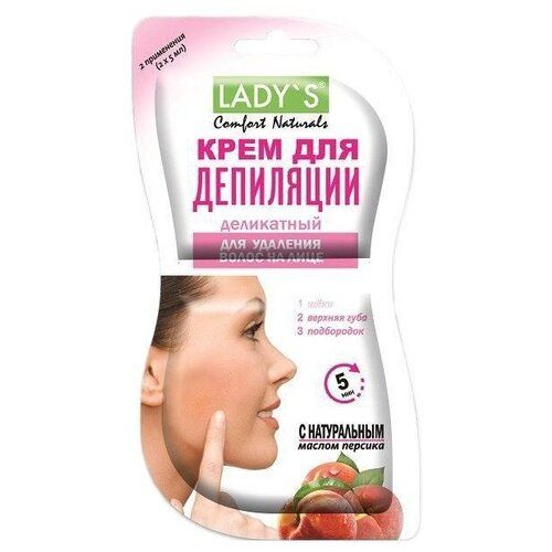 LADY`S Крем для депиляции для лица 10мл - деликатное и мягкое удаление нежелательных волос на лице. Рассчитан на 2 применения. Содержит натуральные масла персика, оливы и какао, а также увлажняющий комплекс "Beauty Wet". Специальная мягкая и деликатная формула крема безопасно и бережно удаляет нежелательные волосы на лице, не вызывая раздражений. При длительном регулярном применении способствует замедлению роста волос, делает их заметно тоньше. Натуральное масло персика, в сочетании с маслом оливы и какао способствует дополнительной защите и смягчению кожи, дарит комфорт и мягкость. Увлажняющий комплекс "Beauty Wet" успокаивает кожу и восполняет недостаток влаги. Достаточно 5-7 минут.
