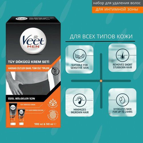 Специально разработанный для интимных зон набор для эпиляции. В упаковке находится тщательно протестированный крем для удаления волос и увлажняющий бальзам для ухода после эпиляции. Применение крема для эпиляции быстрое и простое. Он уничтожает нежелательные волосы всего за 5 минут без риска порезов. Бальзам для ухода после эпиляции увлажняет и успокаивает кожу, а также устраняет зуд при повторном росте волос.