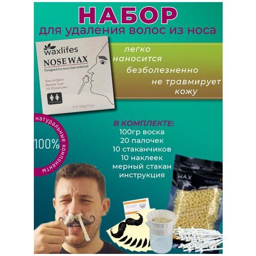 Набор для депиляции волос в носу — это воск для депиляции гранулы, мерный стаканчик, бумажный стаканчик, защита усов, аппликаторы. воск для депиляции можно использовать как воск для бровей, воск для лица. Воск для носа, профессиональный набор для депиляции и удаления волос в носу, позволит удалить нежелательные волосы за считанные секунды. В комплект входит 100г натурального воска без запаха, безопасного в использовании. Подходит для мужчин и женщин. Плюсы депиляции носа воском, в отличие от бритья, выщипывания и триммера, в том, что волосы не растут гораздо дольше. При регулярном проведении депиляции рост волос в носу замедляется, волосы из носа вырываются с корнем, оставляя кожу гладкой до 4 недель. Способ применения: опустите аппликатор в теплый воск (5 гр), вставьте в ноздрю, немного прокрутите, подождите 1-2 мин и резко вытащите. Набор для удаления волос в носу рассчитан на 10-12 применений. Комплектация: Инструкция 1 шт, мерный стаканчик 1 шт, бумажный стаканчик 10 шт, защита усов 10 шт, аппликатор 20 шт, воск для депиляции в носу 100 гр.