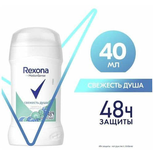 Описание: дезодорант-антиперспирант Rexona Свежесть душа продлевает ощущение чистоты и свежести после душа на целый день. Чистый свежий аромат заряжает бодростью и энергией, а технология Motionsense обеспечивает защиту именно в тот момент, когда она особенно необходима. Микрокапсулы, которые находятся на поверхности кожи, раскрываются, высвобождая заряд дополнительной свежести. Свежесть душа - это воздушный и лёгкий аромат розы и белых цветов в сочетании с бодрящим бергамотом, мятой и ананасом с финальным мускусным аккордом. Благодаря защите от пота и запаха на 48 часов вы будете чувствовать свежесть с раннего утра и до позднего вечера. Антиперспирант сможет подстроиться под ритм вашей жизни. Прогулочный шаг, неспешная пробежка, спринтерский бег ― чем бы вы ни занимались, вы будете чувствовать только уверенность и комфорт.Средство: антиперспирант.Форма выпуска: стик.Время защиты: 48 часов.Особенности средства: арфюмированный.Не содержит: парабены, спирт.Масла: касторовое масло.Полный состав: cyclopentasiloxane, aluminum zirconium tetrachlorohydrex gly, stearyl alcohol, c12-15 alkyl benzoate, ppg-14 butyl ether, hydrogenated castor oil, parfum, polyethylene, bht, caprylic/capric triglyceride, gelatin crosspolymer, cellulose gum, sodium benzoate, aqua, hydrated silica, sodium starch octenylsuccinate, maltodextrin, hydrolyzed corn starch, silica, alpha-isomethyl ionone, benzyl alcohol, benzyl salicylate, citral, coumarin, hexyl cinnamal, limonene, linalool.Аромат: бергамот и мята с нотками жасмина, розы и древесным аккордом; применение: повернуть основание контейнера по стрелке и провести карандашом по чистой и сухой коже подмышек.Срок годности: 546 дня.