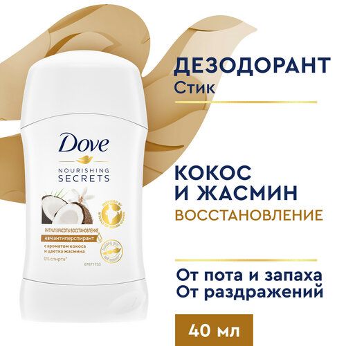 Dove антиперспирант-дезодорант стик женский Ритуал Красоты Восстановление, с ароматом кокоса и цветка жасмина восстанавливает кожу после бритья, на ¼ состоит из увлажняющего крема и не содержит спирта, бережно ухаживает за чувствительной кожей, делая её гладкой и красивой.