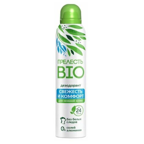 Прелесть БИО Дезодорант Свежесть у комфорт 150 мл. Высокая эффективность против пота и запаха при пониженном содержании солей алюминия. 48 часов безопасной защиты от влаги и запаха. Не содержит спирт и парабены. Благодаря экстракту алоэ вера бережно ухаживает за кожей, предотвращая раздражение. Обладает нежным ароматом и придает ощущение комфорта. Бережная защита и уход