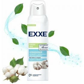 EXXE Fresh SPA Дезодорант спрей женский Невидимый 150мл. Дезодорант EXXE Fresh spa "Невидимый". Дезодорант с тонизирующим цветочным ароматом. Активная формула – 48 часов защиты от запаха. Не оставляет белых пятен и следов на одежде. Защищает кожу и дарит свежесть надолго. Способ применения: перед применением встряхнуть. Распыляйте на чистую сухую кожу подмышек с расстояния не менее 15 см.