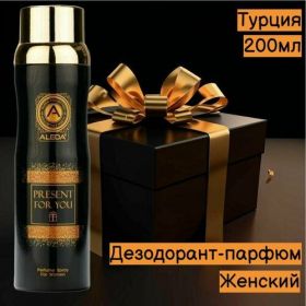 Дезодорант спрей женcкий Aleda Present for You, 200 мл Верхняя нота: фруктовый, цитрусовый. Нота сердца: цветочные. Базовая нота: древесный, мускусный, янтарный. Аэрозоль, 200 мл. Погрузитесь в мир элегантности и роскоши с нашим парфюмированным дезодорантом-спреем для женщин