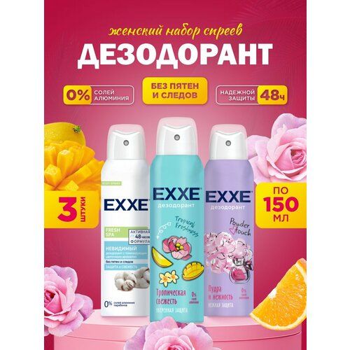 НАЙТИ ВЫГОДНЕЕ - Дезодорант женский EXXE спрей набор Fresh SPA Невидимый 150мл + Пудра и нежность Powder touch 150мл + Тропическая свежесть 150мл