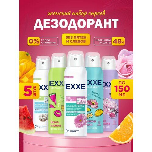 НАЙТИ ВЫГОДНЕЕ - Дезодорант женский EXXE спрей набор Fresh SPA Невидимый 150мл + Нежность шелка + Powder touch + Fruit kiss + Tropical freshness 150мл*5шт