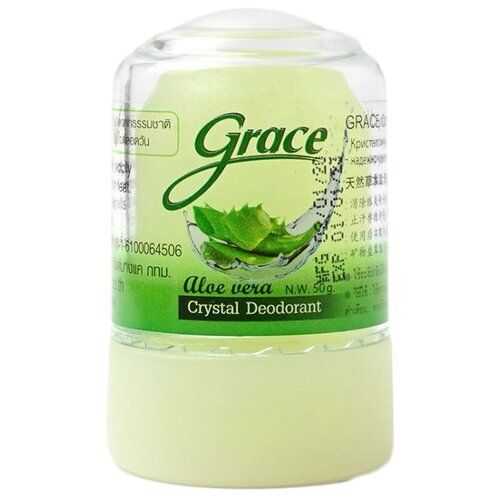 Тайский Дезодорант кристаллический Grace ( Грейс ) Алое вера 50 гр. – минеральный, природный дезодорант, состоящий из натуральных компонентов, не допускает возникновения неприятного запаха. Кристаллический дезодорант подходит как для мужчин, так и для женщин, для беременных женщин и кормящих матерей. Можно использовать подросткам, как мальчикам, так и девочкам. Преимущества: 100% натуральный. Имеет легкий еле уловимый аромат, не конкурирующий с парфюмом. Не оставляет следов на одежде. Эффективен в течение 24 часов. Экономичен. При правильном применении одного кристалла хватает в среднем на 2 - 3 года ежедневного применения. Никакого раздражения и аллергии. Универсален. Способ применения: Наносить дезодорант Grace ( Грейс ) необходимо на чистую влажную кожу. Средство начинает работать, когда на него попадает вода, поэтому если его применяют не после душа, необходимо смочить минерал водой и провести им в зоне подмышек, стоп либо на руках — средство будет работать на любом участке тела. Рекомендации: Дезодорант стик не рекомендуем наносить после бритья или депиляции в первые 3-4 часа, так как это солевой дезодорант может возникнуть пощипывание. Если тайский минерал случайно разбивается, осколки можно собрать и растворить в 100 мл воде. Помещаем полученный раствор в емкость с распылителем и пользуемся дальше в форме дезодоранта-спрея. Ни одно качество продукта при этом не теряется квасцы, вода, экстракт алое, краситель