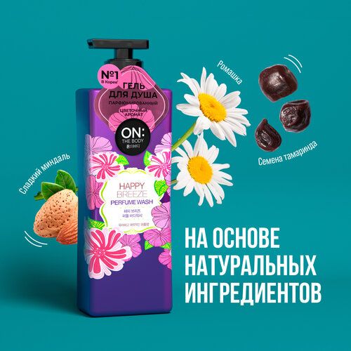 Парфюмированные гели для душа серии ON: The body Perfume делают кожу соблазнительно нежной и дарят незабываемый аромат. ON: The body Perfume Happy breeze - элегантный и притягательный аромат свежей розы и нежной фиалки подарит радость, а экстракт ромашки сделает кожу очаровательно нежной и гладкой. Не содержит: парабенов, компонентов животного происхождения, красителей.