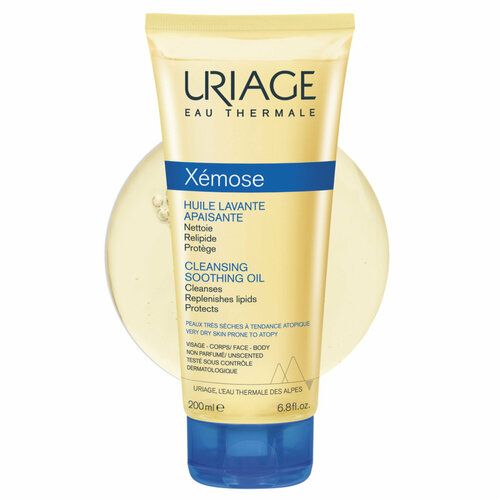 Очищающее успокаивающее масло Ксемоз от Урьяж подходит для сухой и очень сухой кожи, кожи, склонной к атопии, для использования в ванной или душе.