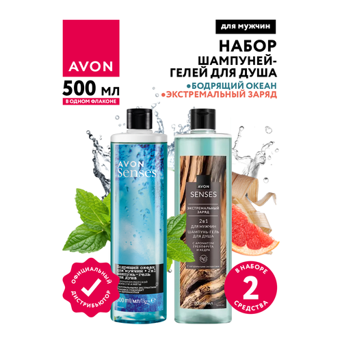 НАЙТИ ВЫГОДНЕЕ - Набор мужских шампунь-гелей для душа Avon Senses Бодрящий океан + Экстремальный заряд по 500 мл.