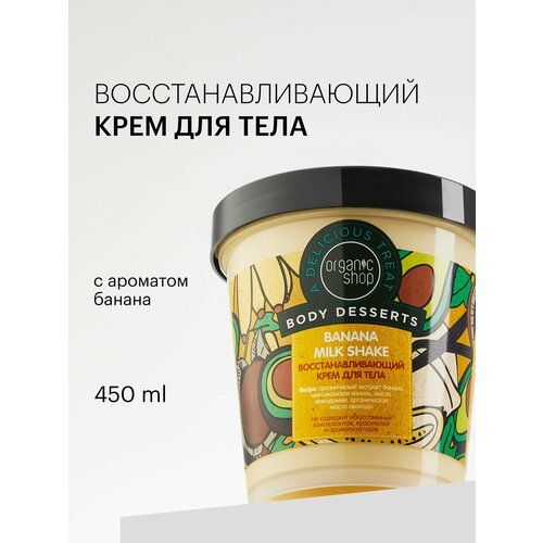 Восстанавливающий крем для тела от растяжек банановый Боди десерт Banana Milk Shake 450 мл — нежное ухаживающее средство для Вашей кожи с супер фудом в составе. Натуральные масла ши (карите), авокадо и ореха макадамии, экстракты ванили и банана обеспечивают интенсивное питание, увлажнение и упругость. Консистенция жирного крема superfood с приятным запахом нежная как у йогурта, мусса или баттера. Подходит для молодой подростковой и взрослой кожи, очень сухой, чувствительной, обезвоженной и склонной к сухости. Питательное сладкое арома суфле убирает шелушения, интенсивно работает на смягчение и восстановление нежности дермы, а также способствует профилактике возникновения и коррекции растяжек. Смягчающее крем-масло с соблазнительным ароматом создано для домашних спа ритуалов — настоящий увлажняющий super food для кожи после душа, бани или сауны, массажа. Ароматизированное средство понравится женщинам и девочкам подросткам. Универсальный женский суперувлажняющий крем большого объема в баночке для ежедневного ухода сделает кожу гладкой, свежей и шелковой. Эко spa косметика от Organic Shop — хорошая идея для того, что можно подарить девушке на любой праздник или просто так, без повода. Идеальный бьюти или новогодний и рождественский подарочек под елку порадует маму, бабушку на 8 марта, Новый год, Рождество и День матери. Покажет чувства для нее любимой жене и второй половинке, подружке на День влюбленных и День святого Валентина 14 февраля. Станет удачным дополнением к подарку подруге, дочке подростку и коллеге на День рождение, др и нг, мамочке, сестре, бабуле и тете на восьмое марта. Органик Шоп — российская веганская, молодежная органическая косметика для всех. В линейках популярного beauty бренда есть все для красоты и здоровья. Eco, vegan, не тестируется на животных