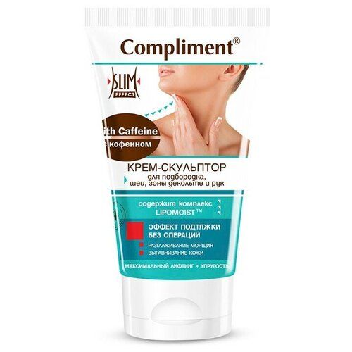 Compliment Крем-скульптор с кофеином для подбородка, шеи, зоны декольте и рук 150 мл Для эффективной борьбы с жировыми отложениями, улучшения лимфооттока, восстановления упругости, выравнивания, подтягивания кожи и коррекции контуров тела косметическая компания «Тимекс» разработала крем-скульптор для подбородка, шеи, зоны декольте и рук Compliment с кофеином. Продукция этого производителя косметики уже много лет пользуется заслуженным спросом на рынке, так как прочно ассоциируется у потребителей со стабильным качеством, высокой эффективностью и выгодной ценой. Для изготовления своих продуктов компания использует только сырье проверенных европейских марок, современные и экологически безопасные рецептуры, которые отличаются гарантированным действием и способны удовлетворить запросы самых требовательных покупателей. Этот уникальный подтягивающий крем создан специалистами косметической марки для эффективной борьбы с жировыми отложениями, восстановления упругости кожи и коррекции тела в области подбородка, шеи, декольте, плеч и внутренней части предплечий. Продукт обладает мягкой природной формулой, обогащенной ценными активными компонентами, куда входят кофеин и специальный комплекс Lipomoist, что позволяет наилучшим образом решать поставленные перед ним задачи. Кожа в этих зонах особо подвержена потере упругости, провисанию, накоплению воды и жира, при минимальных возможностях ее коррекции. За счет содержания комплекса Lipomoist и кофеина продукт комплексно воздействует на кожный покров и тело, вызывая расщепление жировой ткани и выведение продуктов ее распада, улучшая лимфоотток, избавляя от отеков, и одновременно укрепляя, восстанавливая упругость и гладкость кожи. В результате использования данного крема кожа выравнивается и подтягивается, контуры тела в области воздействия становятся более четкими, происходит похудение и активная подтяжка. Состав: Aqua, Butyrospermum Parkii (Shea Butter), Sweet Almond Oil, Potassium Cetyl Phosphate, Xanthan Gum, Pectin, Hydrolyzed Vegetable Protein, Serine, Arginine, Proline, Disodium EDTA, Glyceryl Stearate, Glycerin, Cyclopentasiloxane, Urea, Caffeine, Sodium Polyacrylate, Phenoxyethanol, Perfume, BHT