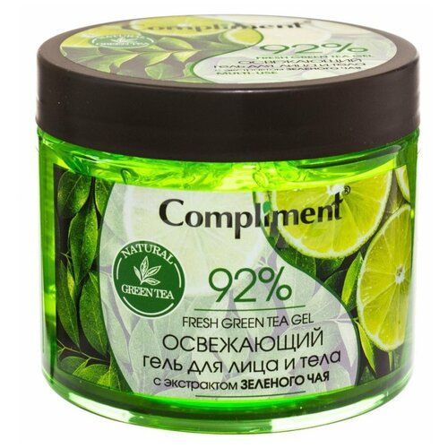 Гель для лица и тела Compliment Освежающий с экстрактом зеленого чая 400мл - это эффективное средство для ухода за кожей тела и лица. В основе его состава лежит натуральный экстракт зеленого чая и лайма, которые обладают освежающими свойствами, повышают тонус кожи и препятствуют ее обезвоживанию. Гель быстро впитывается и оказывает легкий охлаждающий эффект. Его можно использовать для профилактики появления сухости и шелушений, после бритья или загара, для заботы о коже рук и кутикуле. Его легкая текстура подходит для применения в качестве маски для лица или средства для снятия раздражения. Не оставляет ощущения липкости и дискомфорта.
