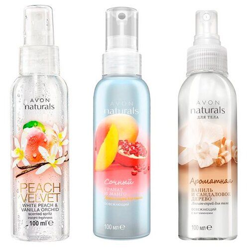НАЙТИ ВЫГОДНЕЕ - AVON Набор спреев для тела Naturals Гранат и манго, Белый персик и ванильная орхидея и Ваниль и сандал, 100 мл, 3 шт.