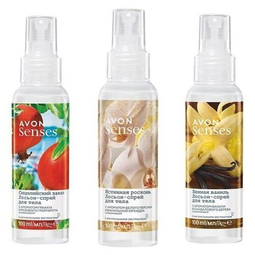НАЙТИ ВЫГОДНЕЕ - AVON Senses Набор спреев для тела 3*100 мл (Гранат и розовый грейпфрут+ Персик и орхидея + Ваниль и сандаловое дерево)