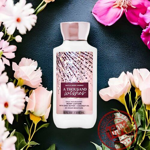 Лосьон для тела Bath & Body Works A THOUSAND WISHES с экстрактами масла ши и кокосового масла помогает питать кожу, делая ее увлажненной в течение 24 часов, делая ее естественно белой и гладкой. вредные вещества, осветляет темные пятна. Лосьон гладкий, быстро впитывается, не вызывает ощущения жирности, дискомфорта после нанесения. Нежный женский аромат с нотами аромата: Розовое просекко, игристая айва, хрустальные пионы, позолоченная амбраикремамаретто Безвредные ингредиенты, подходят для всех типов кожи.