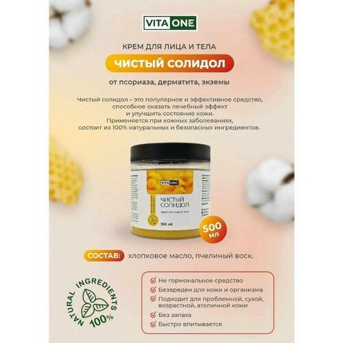 Одним из самых популярных и эффективных средств при кожных заболеваниях является Солидол медицинский очищенный на основе нефтяных масел. Мы долго искали альтернативу, которая будет также эффективна но на 100% состоять из натуральных и безопасных ингредиентов. Хотим Вам представить крем для лица и тела Чистый Солидол в составе только хлопковое масло и пчелиный воск. Мазь или крем с пчелиным воском может использоваться для лечения и профилактики, таких болезней как: воспалительные процессы на коже разного происхождения; нейродермите; аллергических дерматозах, в т. ч. атопическом дерматите; экземе; варикозе; сухости, шелушении и покраснении кожи; витилиго; псориаз и др. Для заживления ран; микроповреждений; от царапин; трещин на пятках; ожогов; помогает при лечении прыщей, акне, угрей у подростков. Главное преимущество средств на основе натурального воска - это их польза и безопасность. Можно применять взрослым и детям (при отсутствии аллергии на продукты пчеловодства). Крем для лица Чистый Солидол способен оказывать омолаживающий эффект. Пчелиный воск в составе хорошо смягчает, питает и защищает кожу от ветра и холода. Он покрывает кожу тоненькой защитной пленкой, что способствует удержанию влаги. Если наносить средство на руки, оно будет защищать кожу от холода и бытовой химии, использовать для локтей от сухости. Чистый Солидол поддерживает молодость и упругость лица. Обладает высоким терапевтическим эффектом, глубоко проникает в кожу. Оказывает противовоспалительное, противозудное, заживляющее и регенерирующее действие. Уменьшается раздражение и шелушение кожи, улучшается эпителизация, уменьшаются язвенные поражения и исчезает зуд кожных покровов, жжение, боли и другие неприятные ощущения. Защищает кожу от пересыхания, укрепляет ногтевую пластину, смягчает огрубевшие участки. Не гормональное средство, абсолютно безвреден для кожи и организма. Подходит для проблемной, сухой, возрастной, атопичной кожи. Время нанесения день/ночь. Без запаха. Быстро впитывается. Противопоказания: индивидуальная непереносимость компонентов. Условия хранения: Хранить в темном месте при температуре от 0°C до 25°C и относительной влажности воздуха не более 70%. После вскрытия хранить в холодильнике.