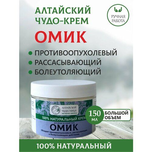 Алтайская натуральная мазь с экстрактом корня омика и болиголова обладает мощным противовоспалительным, противоопухолевым, рассасывающим и болеутоляющим действием. Благодаря мягкому воздействию мази уменьшаются болевые ощущения, улучшается кровоток в поврежденных тканях и стимулируется их регенерация. Фиброзные очаги и солевые отложения постепенно расасываются. Способствует предотвращению роста опухолей как доброкачественной, так и злокачественной природы. Применяется при уплотнениях, любых шишках на коже, при наружных опухолях, воспалении лимфатических узлов, узловом зобе щитовидной железы, аденоме простаты, мастопатии, при наружном геморрое, межпозвоночных и паховых грыжах. Мазь при болях в суставах, болях в спине и шее, болях в мышцах, артрозе, артрите, остеохондрозе, растяжении связок, травмах и ушибах, вывихах. Способ применения: наносить на проблемные места 2-3 раза в день. Противопоказания: индивидуальная непереносимость компонентов, беременность. Для наружного применения.