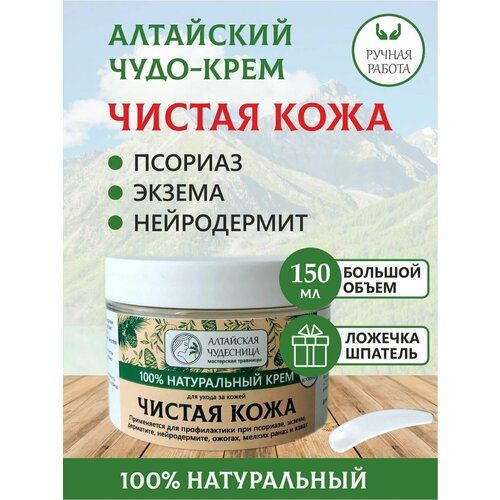 Натуральный крем «Чистая кожа». Ручная работа. Изготовлен из натуральных компонентов и целебных трав Горного Алтая. Компоненты, входящие в состав крема, обладают противовоспалительным, противомикробным, смягчающим и увлажняющим действием. Способствует уменьшению зуда и раздражения, отшелушиванию, естественной регенерации и восстановлению кожи. Применяется для профилактики при псориазе, экземе, дерматите, нейродермите, ожогах, мелких ранах и язвах.