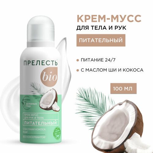 Крем-мусс Прелесть БИО имеет воздушную текстуру, легко и приятно распределяется по коже, быстро впитывается и не оставляет неприятной липкости или пленки. Он создает ощущение комфорта и увлажнения, делая кожу более мягкой и гладкой. ∙ Питает кожу, помогает удерживать влагу в коже, делая ее более увлажненной и мягкой. ∙ Питательный крем создает защитный барьер на поверхности кожи, который помогает защитить ее от вредных воздействий окружающей среды. ∙ Идеально подходит не только для кожи рук, но и для тела. ∙ Без консервантов, минеральных масел, силиконов, парабенов и красителей.* Наслаждайтесь здоровой, сияющей кожей каждый день