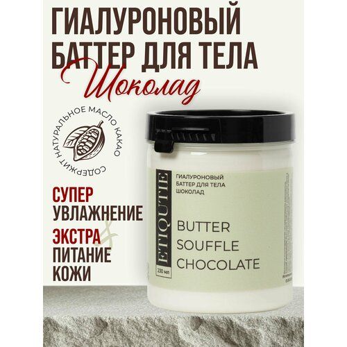 Подарите своей коже нежный уход с Гиалуроновым Баттером для тела в шоколадном исполнении от ETIQUTIE. Этот крем для ухода за кожей разработан для глубокой гидратации и питания, придавая вашей коже невероятную мягкость и эластичность. Инновационная формула, обогащенная гиалуроновой кислотой и коллагеном, помогает восстанавливать структуру кожи, а насыщенные шоколадные ноты делают процесс ухода максимально приятным.