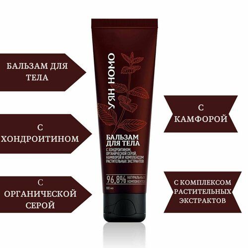 Бальзам для тела Уян Номо (Гибкий Лук) с хондроитином - это классическая формула помощи суставам. Быстро устраняет чувство дискомфорта и отечность, нормализует обменные процессы в суставах, повышает их подвижность. Для легкости движения в любом возрасте Природные восстанавливающие вещества Хондроитин, органическая сера и пихтовая живица улучшают межклеточное взаимодействие в тканях, ускоряет процесс регенерации соединительной ткани и улучшает выработку суставной смазки. Транспортный агентФермент папайи улучшает проникновение активных компонентов и ускоряет действие бальзама. Тактильные активаторыКамфора и ментол оказывают местное раздражающее действие. Способствуют расслаблению тканей и снижению болевых ощущений. Растительные экстрактыЭкстракты окопника и сабельника помогают справиться с воспалительными процессами в тканях, снижают отечность. Эфирные маслаПомогают снять напряжение, способствуют восстановлению легкости движений и улучшают эмоциональный фон. Быстрая помощь в любой ситуации– при болях в пояснице и шее;– заболеваниях суставов;– восстановлении после физических нагрузок;– остеохондрозе;– отеках, ушибах и синяках. А также в качестве оперативного средства, если застудили шею