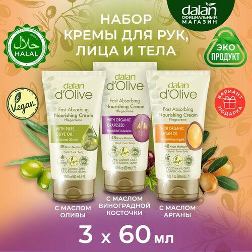 НАЙТИ ВЫГОДНЕЕ - Натуральный турецкий крем для рук, лица и тела Dalan d'Olive Увлажняющий и Питательный, Подарочный набор 3 шт х 60 мл