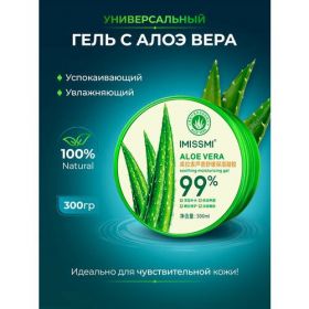 Алое гель – это многофункциональное и незаменимое средство для всей семьи и настоящее спасение для чувствительной и сухой кожи. Особенность геля IMISSMI в качественных компонентах и наличии удобной лопаточки, избавляющей от необходимости лезть руками в банку. Увлажняющий, успокаивающий, восстанавливающий и охлаждающий гель с экстрактом алоэ подойдет для ежедневного увлажнения кожи, после бритья, для восстановления ран, детских царапин и многого другого. Он Смягчающий, а в его составе 99% гипоаллергенного экстракта алое вера который славится своими восстанавливающими и защитными свойствами.
