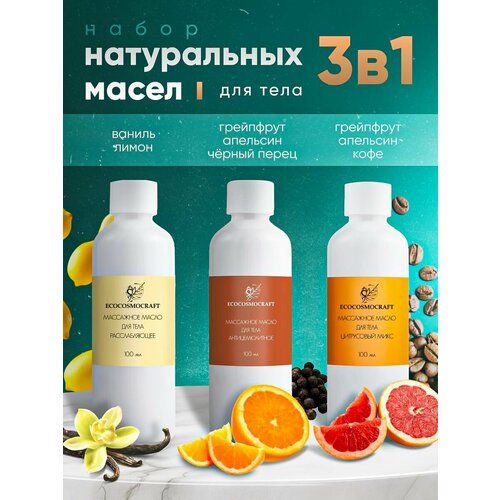 Подарочный набор массажных масел создан с любовью брендом ECOCOSMOCRAFT и самой природой антицеллюлитное, расслабляющее, цитрусовый микс для всех типов кожи. Теперь Ваш массаж станет не только приятным, но и полезным. Эфирные масла в составе делают кожу эластичной, способствуют улучшению кровообращения в проблемных зонах, что способствует уменьшению целлюлита, предотвращению растяжек. Натуральные масла в составе активно ухаживают, увлажняют, питают и защищают кожу. Ароматы средств подобраны тщательным образом и дарят ощущение комфорта и гармонии от процедуры. Продукт не забивает поры. Масла подходят для всех техник массажа, баночного, вакуумного, косметического ручного. Обеспечивают легкое скольжение, не оставляют ощущение липкости. Способ применения: небольшое количество разотрите в руках, затем начните массировать нужную зону. Наносить средство рекомендуем на чистую сухую кожу. Здоровая и красивая кожа – теперь реальность Натуральные продукты для красоты от ECOCOSMOCRAFT - лучший подарок.