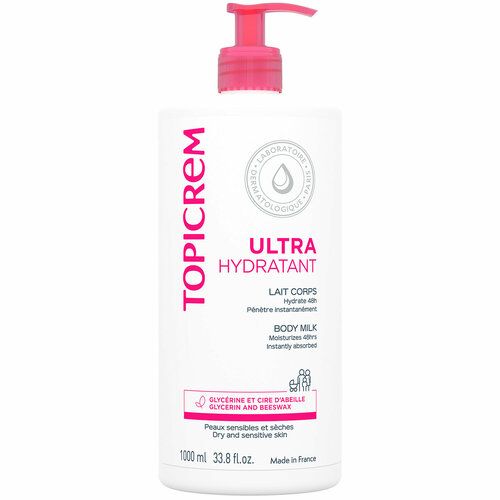 Ультра-увлажняющее молочко для тела Topicrem — нежное молочко, обогащенное увлажняющими компонентами (глицерин, мочевина), обеспечивает увлажнение и защиту кожи на протяжении 48-ми часов, а также устраняет признаки сухой кожи. Особенно подходит для сухой и/или обезвоженной (под действием разных факторов) кожи, а также для нежной детской кожи.