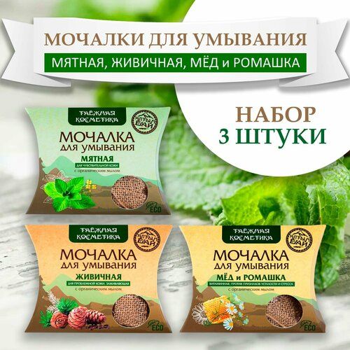 НАЙТИ ВЫГОДНЕЕ - Набор льняных мочалок для умывания 3 шт х 60 гр (Живичная, Мед и ромашка, Мятная), Алтынбай