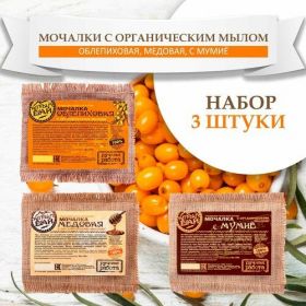 НАЙТИ ВЫГОДНЕЕ - Набор льняных мочалок для тела с органическим мылом 3 шт х 130 гр (Медовая, С мумие, Облепиховая), Алтынбай
