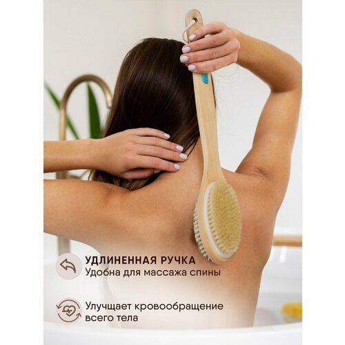 Уникальная двусторонняя масажная щетка для тела. Щетка для массажа тела имеет мягкую и жесткую щетины. Массажную щетку можно использовать как для сухого массажа тела, так и для влажного. Влажный массаж тела проводят с нанесением скраба или геля для душа. Сухой массаж считается более жестким, но и эффективным. Влажный метод массажа понравится чувствительной коже и точно не травмирует ее. Антицеллюлитная щетка для тела отшелушивает мертвые клетки, делает кожу более упругой и эластичной. Массаж щеткой - отличное средство от целлюлита. Также массажная щетка подойдет для бани и душа. Массаж щеткой улучшает кровообращение и лимфоотток. Только натуральные материалы: натуральная щетина из кабана, бамбук. Прекрасный массажер для тела. Длинная эргономичная ручка для массажа спины, шеи и плеч, спины, ног и головы. Также щетка предупреждает врастание волос. Профессиональный антицеллюлитный массажер у Вас дома. Дренажная щетка это отличный подарок подруге, маме, сестре