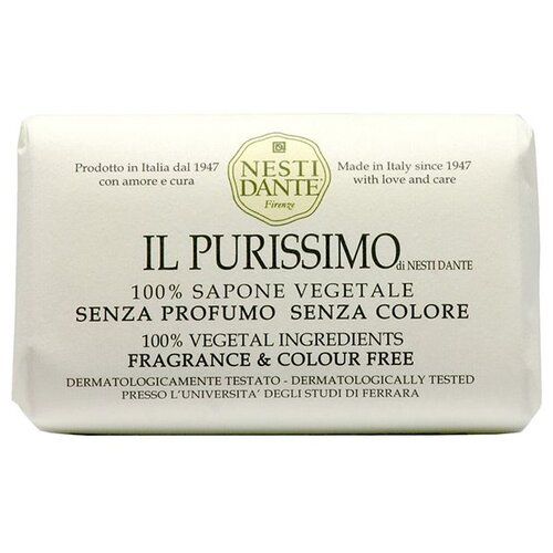 **NESTI DANTE IL PURISSIMO Нежное.** Чистое и нежное растительное мыло не содержащее отдушек и красителей. В состав мыло входят только растительные, натуральные компоненты. Природная защита и увлажнение для самой чувствительной кожи. Экологически чистое туалетное мыло NESTI DANTE - это мыло, обогащенное растительными экстрактами и маслами. Не содержит вредных ПАВ, сульфатов, парабенов, синтетических масел и искусственных красителей. Без ингредиентов животного происхождения. Действие щелочи нивелируется достаточным количеством увлажняющих и питательных ингредиентов. Прекрасно пенится. NESTI DANTE имеет структуру наивысшего качества, высокую плотность и нежность, мыло не рассыхается, не размокает в мыльнице и остается цельным длительное время. Состав: Пальмат натрия, кокоат натрия/пальмкернелат натрия, аква (вода), глицерин, хлорид натрия, тетразодиевый этидронат, пентанатриевый пентетат. О качестве говорят много, но что такое качество мыла NESTI DANTE? Использование сырья настолько благородно и отборно, что часто находит применение в пищевой промышленности. Ингредиенты высшего качества отобраны без компромиссов. итальянское мыло Nesti dante цельные растительные масла с экологически чистых и возобновляемых плантаций. Без сульфатов, парабенов, синтетических поверхностно-активных веществ и минеральных масел. Не содержит эдта. Подходит для веганов, не содержит ингредиентов животного происхождения. Полностью перерабатываемая упаковка. Готовится во Флоренции с любовью и заботой с 1947 года. Мыло косметическое Nesti Dante производится традиционным методом намыливания в котле. Мы делаем это с любовью и заботой во Флоренции с 1947 года. Большинство производителей покупают мыльную стружку на рынках Дальнего Востока, а мы производим ее сами, исходя из качественных масел. мыло туалетное Nesti dante туалетное Традиционный метод в котле, требующий более четырех дней обработки, гарантирует использование только благородной части омыления, исключая примеси и лишнюю воду: именно поэтому наше мыло не тает на раковине и не трескается во время использования. С другой стороны, непрерывный метод дает базовую пасту, которая не свободна от примесей, поскольку в ней используется все содержимое котла. Nesti Dante использует только цельные масла, настолько благородные, что их часто используют в пищевой промышленности, а не фракции жирных кислот. Это позволяет получить базовую пасту без маскирующих фоновых запахов, а духи могут проявить себя во всей красе и сохраняться до конца. Мыло Nesti Dante soap трижды вытягивается (тройной помол) на специальном оборудовании из нержавеющей стали. Этот длительный процесс гарантирует компактное, гладкое мыло, обработанное до мельчайших деталей, которое прослужит дольше. Натуральное мыло Nesti Dante не содержит сульфатов, парабенов, синтетических поверхностно-активных веществ и минеральных масел. Il Purissimo (Нежное) олицетворяет нежность, чистоту, легкость – название мыла говорит само за себя. Сырьём для этого мыла послужило масло, получаемое из плодов масличной пальмы — отлично увлажняет и защищает кожу — и омыленное кокосовое масло (sodium cocoate) — хорошо очищает кожу, но при этом не нарушает водно-липидный барьер, смягчает и увлажняет эпидермис, помогая сохранить все его защитные функции. Мыло не сушит кожу, не содержит отдушек и красителей. Деликатно заботится о 