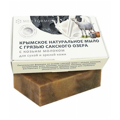MED-formula «На козьем молоке» содержит лечебную грязь Сакского озера, дополненную сбалансированным комплексом природных компонентов, разработанным для бережного ухода за уставшей кожей, испытывающей недостаток питательных веществ. Козье молоко - уникальный компонент этого мыла, способный восстанавливать природный коллаген кожи, тем самым уменьшая признаки старения, улучшает цвет лица. Экстракт алоэ открывает и очищает поры, глубоко проникая в кожу, восстанавливает обмен веществ. Экстракт крапивы ценится в косметологии благодаря сочетанию вяжущих свойств, антисептического и дезинфицирующего действия хлорофилла. Экстракт петрушки снимает покраснение кожи и отечность, осветляет, освежает и тонизирует кожу. Масла шиповника и расторопши относятся к самым питательным и витаминизирующим средствам для кожи. Нежная аромакомпозиция эфирных масел закрепляет питательный эффект активных компонентов этого мыла.