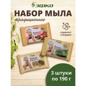 Набор из 3 видов мыла по 190 грамм: Банное, Хвойное и Земляничное. Традиционное туалетное мыло "Банное" эфко хорошо пенится, очищает кожу и обладает приятным классическим ароматом. Мыло белого цвета с кремовым оттенком имеет прямоугольную форму с закругленными углами. Традиционное туалетное мыло производится по классической технологии на основе натуральных растительных масел и содержит глицерин, который мягко ухаживает за кожей. Проверенная, успевшая заслужить доверие, рецептура мыла является залогом отличного качества. Хвойное традиционное туалетное мыло содержит глицерин, сделано на основе натуральных растительных масел. Это оптимальный вариант для практичных семей, где ценят традиционное качество. Аромат хвои в туалетном мыле Хвойное делает этот продукт приятным в использовании на даче, в бане и дома. Благодаря большому содержанию жирных кислот образует большое количество пены. Традиционное туалетное мыло эфко "Земляничное" хорошо пенится, очищает кожу и имеет приятный классический аромат. Мыло розового цвета имеет прямоугольную форму с закругленными углами.