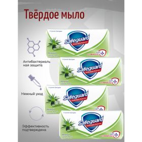 Попробуйте очищающее твердое мыло Safeguard (Сейфгард) Нежный уход с Алоэ в упаковке 90 г. Формула Щит от микробов с антибактериальными ингредиентами и деликатным ароматом алоэ смывает грязь и бактерии с рук, помогая ежедневной защите от микробов. По данным Всемирной организации здравоохранения, тщательное мытье рук – наиболее эффективный метод предотвращения распространения вирусов. Safeguard, защищаем семьи с 1963 года. Способ применения: намыльте ладони, обработайте тыльную поверхность, зоны между пальцами и под ногтями, ополосните руки водой и высушите полотенцем. Рекомендуемая продолжительность мытья рук – 40-60 секунд.