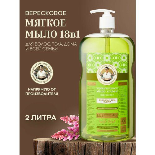 Удивительное вересковое мыло по рецептам бабушки Агафьи 2 литра совмещает в себе сразу 18 способов применения. Питательное и увлажняющее, оно бережно очищает волосы, кожу головы и тело. Не сушит руки во время ручной стирки белья, мытья кухонной посуды, фруктов и овощей. Универсальное очищающее средство — настоящая находка для загородного дома, бани и сауны. Ипользуется как шампунь и гель для душа, а также применимо в домашних хозяйственных целях для уборки. Дает хорошую пену и эффективно очищает, легко смывается, оставляя после себя приятный аромат, чистоту и свежесть.