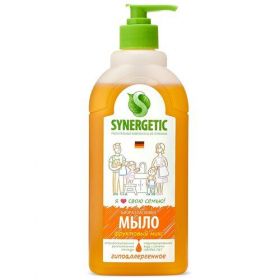 Артикул: 0669-185. Материал: См. на упаковке, Вес: 540 гр, Вид мыла: Кухонное, Размер упаковки: 21 x 8 x 5 см, Вес, г/Объём, мл: 500, Тип: Жидкое, Цвет: Оранжевый, Аромат: Фруктовый микс. Биоразлагаемое увлажняющее мыло SYNERGETIC "Фруктовый микс" подходит для бережного очищения кожи рук и тела от любых загрязнений. Комбинация растительных А-тензидов, морской соли и натуральных эфирных масел пачули, жасмина, ветивера, нероли и розы эффективно устраняет загрязнения и неприятные запахи даже в холодной воде. Растительный глицерин обеспечивает интенсивное увлажнение кожи. Мультифункциональный компонент софоролипид мягко очищает и заботится о естественном микробиоме кожи. Гипоаллергенное средство подходит для чувствительной кожи. Мыло дерматологически протестировано независимым исследовательским институтом Dermatest®? в Германии. Биоразлагаемые компоненты безопасны для природы и человека и не вредят микрофлоре септических установок. Жидкое мыло не содержит компонентов животного происхождения, не тестируется на животных и сертифицировано британской организацией The Vegan Society. Знак Vegan - мировой стандарт этичной продукции. Нанести небольшое количество на влажную кожу, вспенить, смыть водой. Беречь от детей. При попадании средства в глаза промыть водой. Использовать строго по назначению. Aqua (подготовленная вода); Sodium Laureth Sulfate (ПАВ из пальмового масла); Sodium Lauroamphoacetate (мягкий ПАВ из пальмового масла); PEG-4 Rapeseedamide (солюбилизатор из рапсового масла); Glycerin (увлажняющий компонент растительного происхождения); Sea Salt (морская соль); Citric Acid (лимонная кислота растительного происхождения); Candida Bombicola/Glucose/Methyl Rapeseedate Ferment (ферментированный ПАВ из пшеницы и рапсового масла); Nonallergic Parfume with Natural Oils: Geranium Oil, Neroli Oil, Jasmine Oil, Rose Otto Oil (гипоаллергенная отдушка с натуральными эфирными маслами герани, нероли, жасмина, розы); Food Dye Carmoisine (пищевой краситель); Sodium Benzoate (природный консервант).