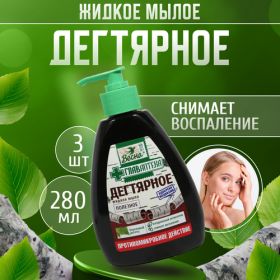 Мыло жидкое антибактериальное с дозатором Дегтярное темно-коричневого цвета обладает густой консистенцией, специфическим натуральным запахом березового дегтя, прекрасно подходит для умывания лица, рук, тела, волос. Жидкое мыло глубоко очищает проблемную кожу, подсушивает, обладает ранозаживляющим, противовоспалительным, противомикробным действием, помогает избавится от угрей, черных точек, снимает воспаление, улучшает кровоснабжение, является натуральным антисептиком. Дегтярное мыло хорошо пенится, быстро смывается, не сушит, не раздражает, не вызывает ощущения стянутости.