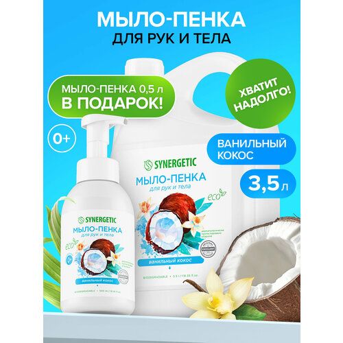 НАЙТИ ВЫГОДНЕЕ - Набор SYNERGETIC Мыло-пенка для рук и тела Ванильный кокос 3,5 л + флакон-подарок 0,5 л с пенообразующей насадкой