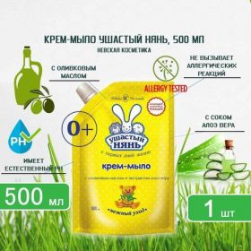 Жидкое крем мыло для детей ушастый нянь содержит природные ингредиенты в составе: сок алоэ вера и масло оливы, которые положительно влияют на состояние кожи. Сок алоэ повышает тонус и обеспечивает увлажнение, обладает антибактериальными свойствами, заживляет и снимает воспаления. Масло оливы питает и смягчает, полностью восполняет гидролипидный баланс. Крем-мыло с дозатором Ушастый нянь гипоаллергенно и предназначено для деликатного ухода за кожей младенцев с рождения. Также оно подходит для взрослых с кожей повышенной чувствительности, склонной к раздражениям, высыпаниям. Уровень рН мыла близок к рН кожи. Крем-мыло для новорожденных ушастый нянь предназначено не только для мытья рук, также его можно использовать как гель для душа.