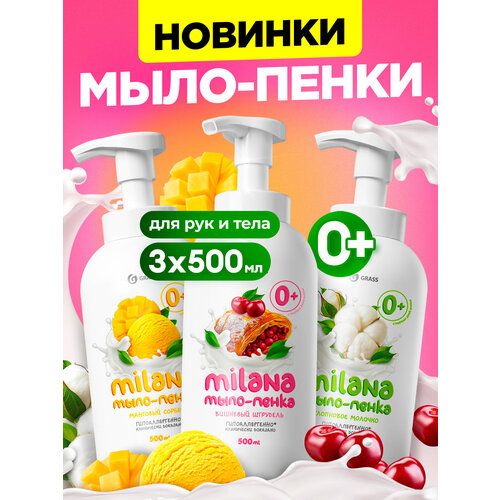 НАЙТИ ВЫГОДНЕЕ - Жидкое мыло пенка Grass Milana с дозатором, по 500мл набор из 3шт, аромат Вишнёвый штрудель, Манговый сорбет, Хлопковое молочко